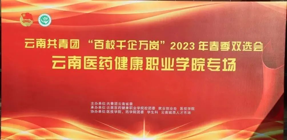 为深入贯彻落实总书记关于青年工作的重要思想,全面落实中央、省委关于高校毕业生就业工作的决策部署。2023年4月11日云南医药健康职业学院医技学院在海源校区举办云南省共青团“百校千企万岗”2023年春季双选会·云南医药健康职业学院专场招聘会。活动由医技学院、校团委、就业创业处承办。药学院团委,学生科,云南城西人才市场协办。本次双选会共邀请到昆明大滇医院有限公司、云南乐和经贸有限公司、山西振东健康产业集团有限公司等23家用人单位,为毕业生提供涵盖不同层次、不同专业的80余个岗位。