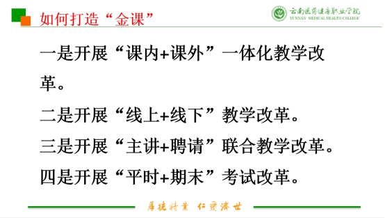 为贯彻落实全国教育大会和新时代全国高等学校教育工作会议精神,进一步探讨如何在“双一流”建设的大背景下做好做强一流专业和一流课程建设,同时也为深化医教协同推进医学教育改革与发展,以提升研究生教育质量为核心,全面提升人才培养质量、优化人才培养结构,加强医教协同管理,不断探索深度融合的学科建设和人才培养新模式2022322日,云南医药健康职业学院医技学院在康养中心三楼会议室组织全体教师开展专题分享本次培训由丁伟院长主讲